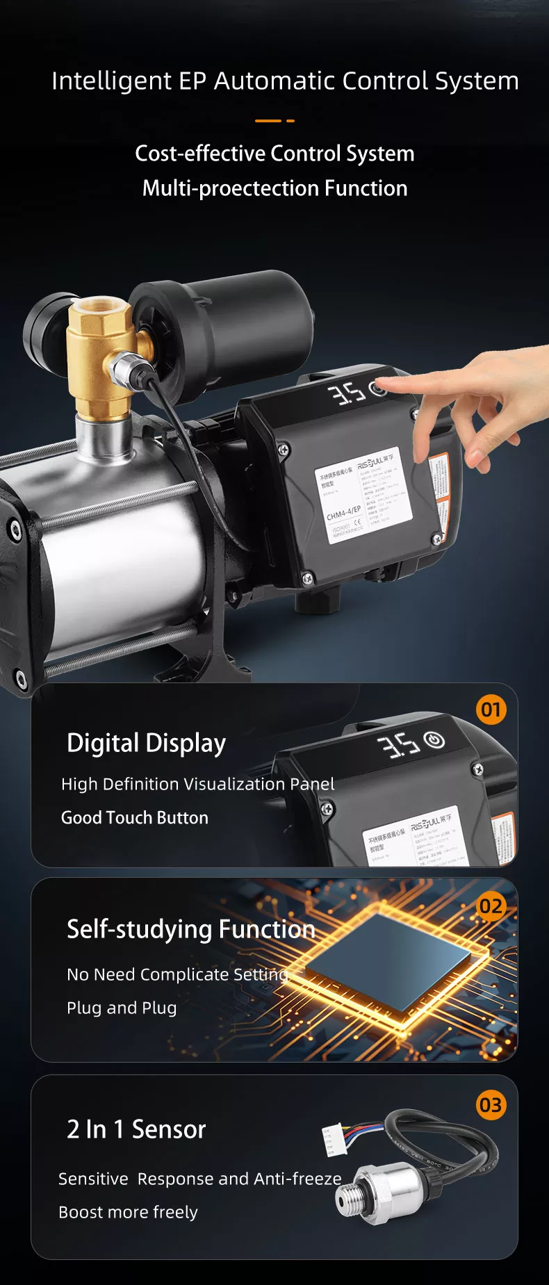 | CHM2-4/EP | 0.55 | 4.5 | 40 | 2m³/h@32m | 4 | 322x174x255 | 12.5 |