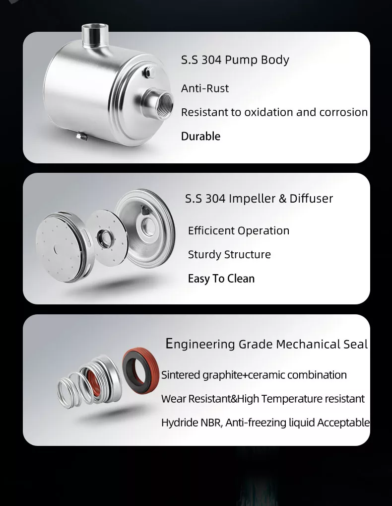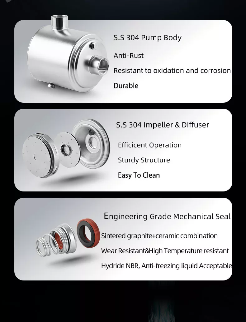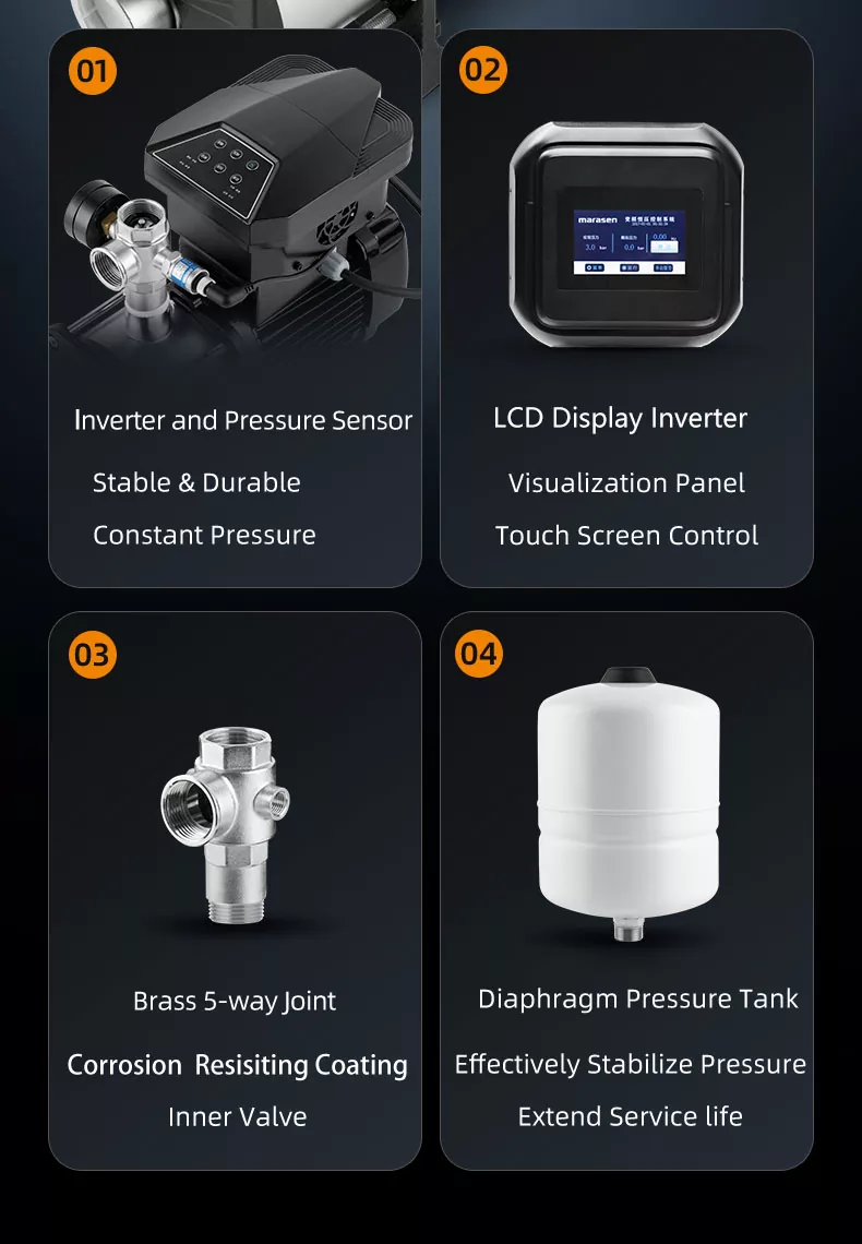 3. Гъвкави приложения: Независимо дали трябва да повишите водното налягане в сгради, напоителни системи или промишлени процеси, тази помпа е достатъчно гъвкава, за да посрещне с лекота широк спектър от нужди.