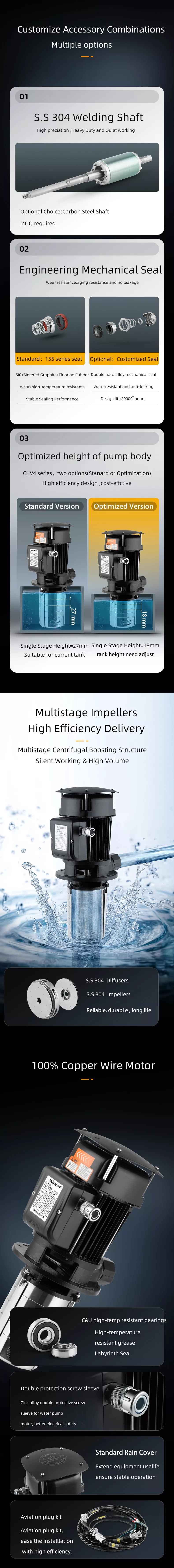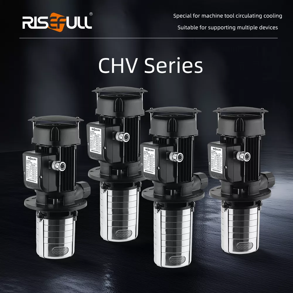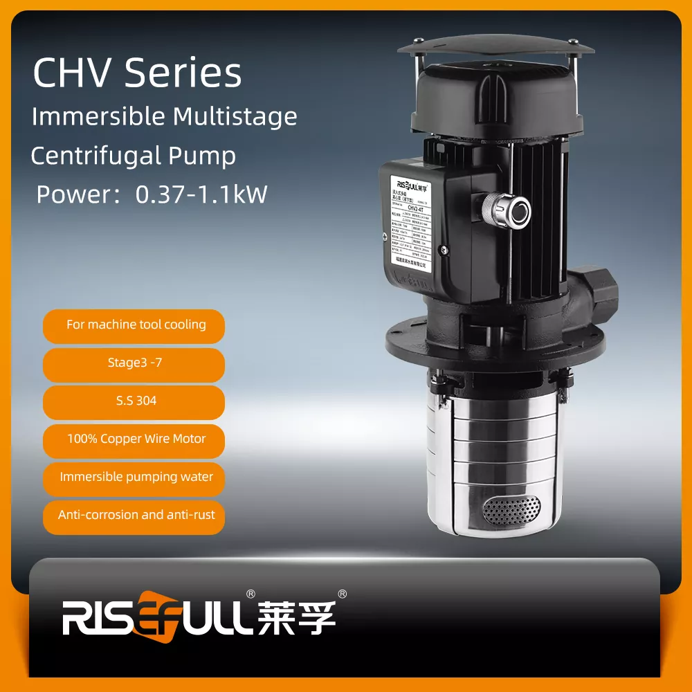 Следва представяне на серията CHV. Потопяемата многостъпална центробежна помпа CHV, известна още като потопяема помпа или машинна помпа, се използва за транспортиране на охлаждаща течност за машинни инструменти, смазка, пренос на кондензирана вода, промишлено почистващо оборудване, системи за филтриране и други приложения, подходящи за използване на потопени помпи. Той е идеален за интегриране с машинни инструменти, шлифовъчни машини, CNC обработващи центрове, EDM машини, промишлени почистващи машини и друго оборудване.