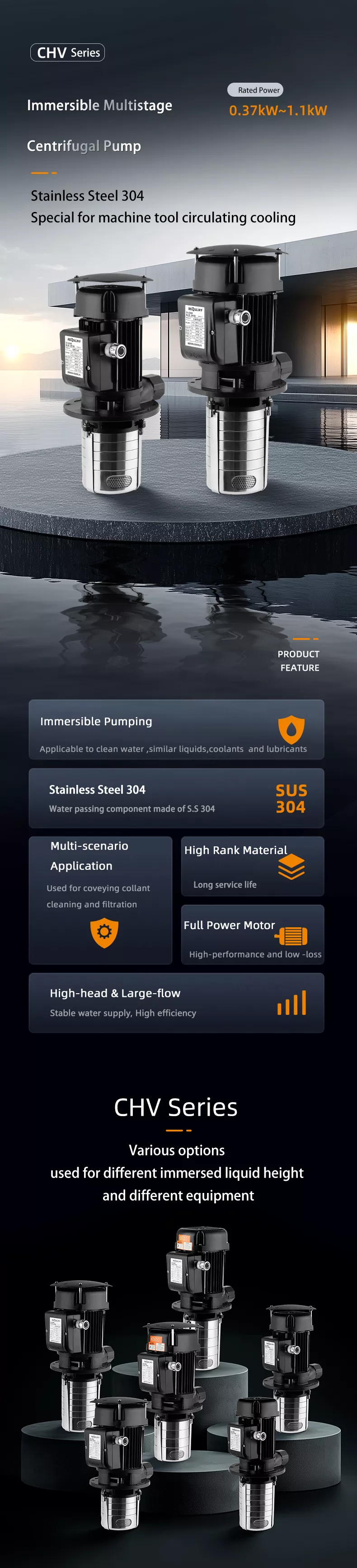 Следва представяне на серията CHV. Потопяемата многостъпална центробежна помпа CHV, специално проектирана за изпомпване на охлаждащи смазочни материали за машинни инструменти и за монтиране върху резервоари с помпен стек, потопен в изпомпваната течност. STAIRS SBK помпите се предлагат с различни размери на помпата и различен брой степени, за да осигурят дебит, налягане и необходимата дължина.