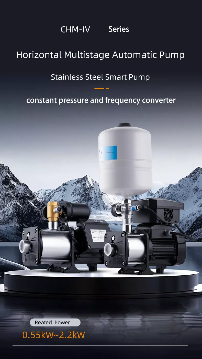 Серия CHM12/IV SMART SMART серия от серии от серия от неръждаема стомана многостепенна центробежна помпа е сравнително зрял продукт на пазара в момента, който е с компактна структура и стабилен работещ, нисък работен шум, еиета до 44-70%. Всички компоненти за преминаване на вода са изработени от AISI304 от неръждаема стомана. Той се използва широко в