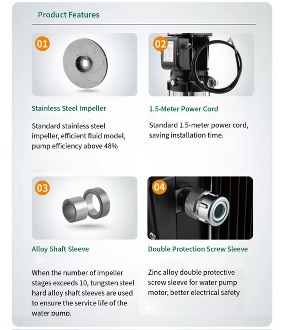· Механични уплътнения, изработени от твърда сплав + флуор каучук, намаляват течовете и консумацията на енергия, осигурявайки гладка и тиха работа.
