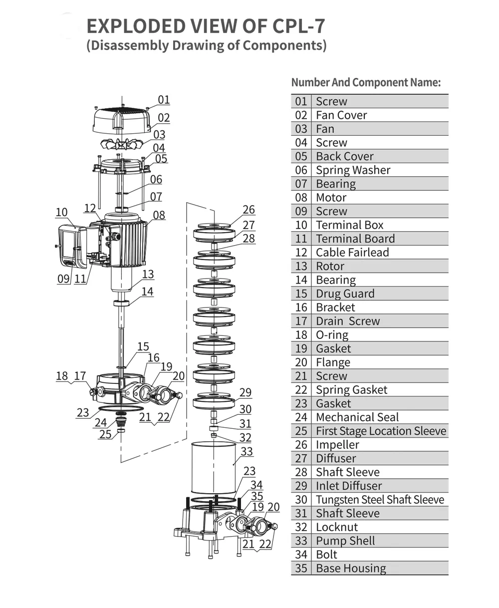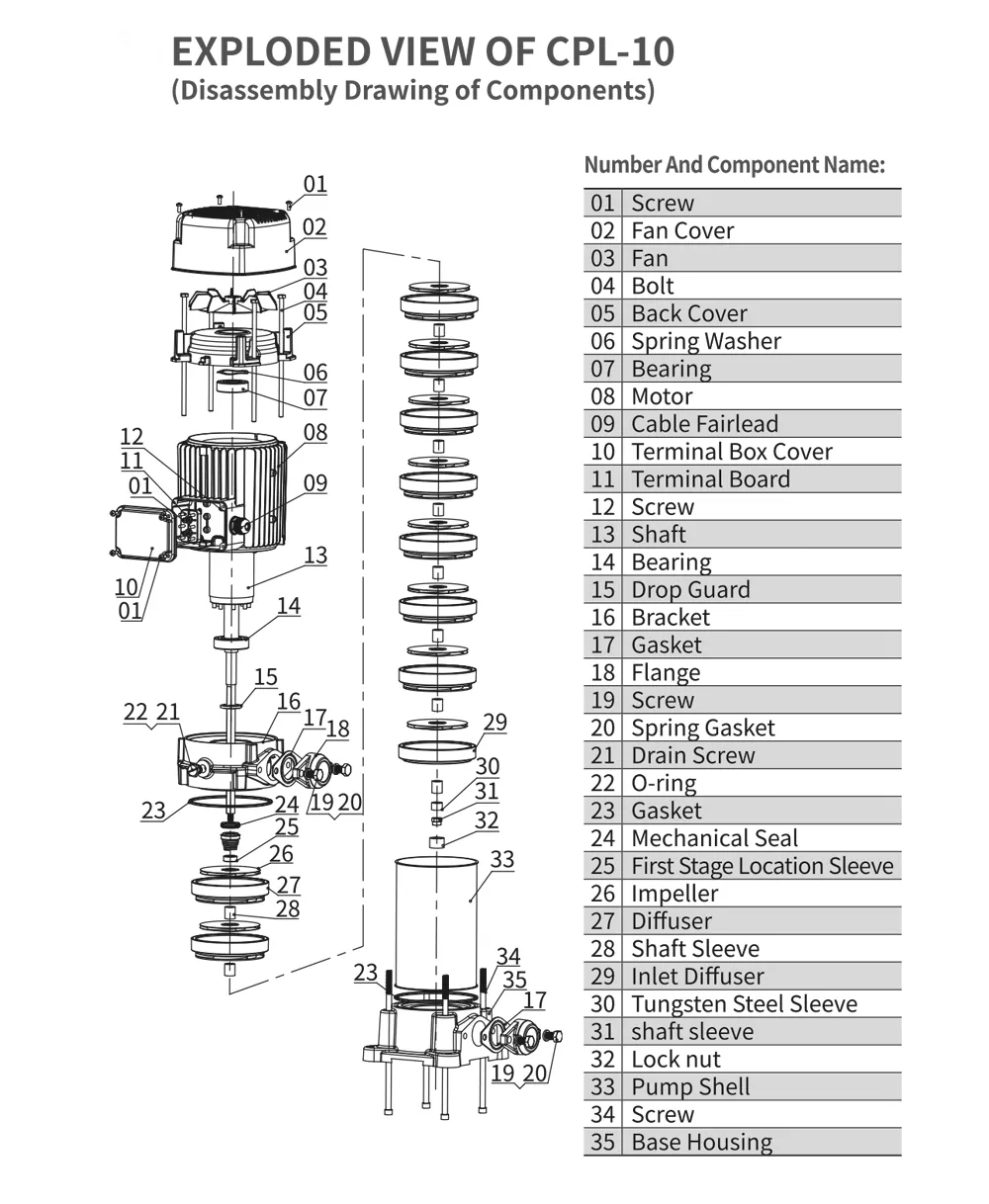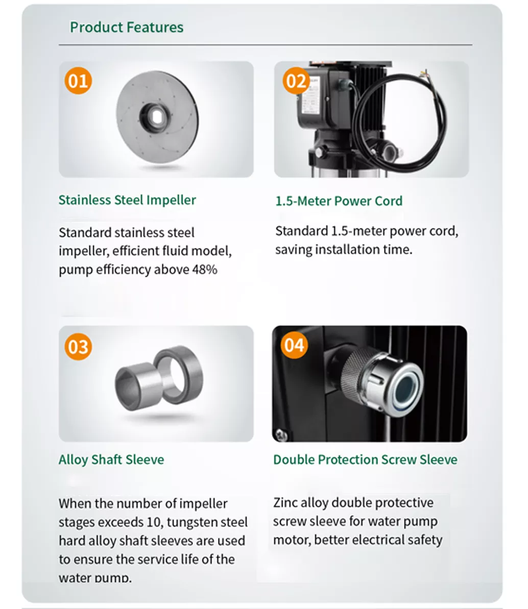 Напорът на помпата може да се регулира чрез промяна на броя на работните колела, за да отговори на различни изисквания. Подходящ е за чиста вода или течности с подобни свойства, докато някои модели могат да бъдат персонализирани за корозивни среди.
